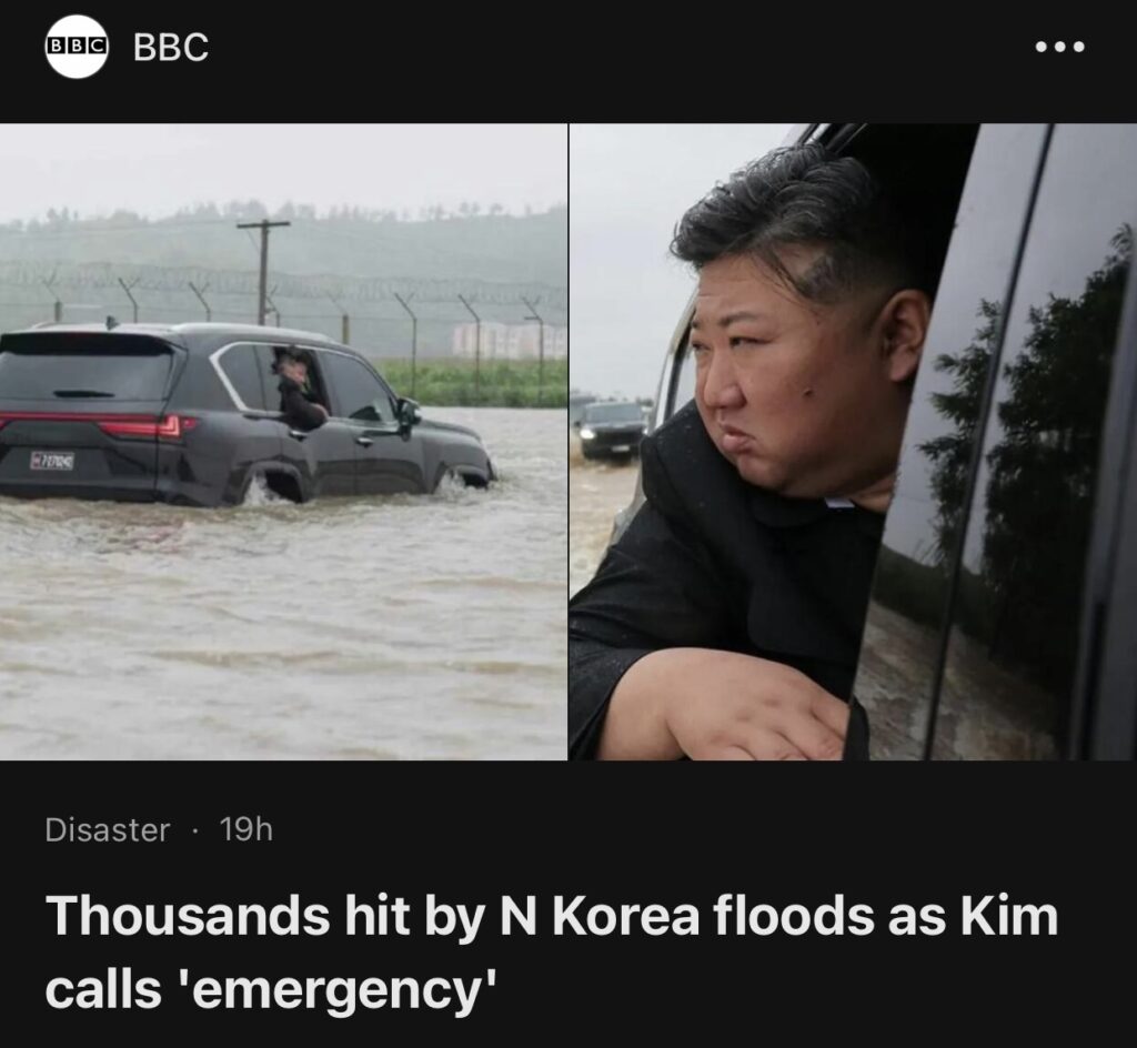 9。据BBC News 报道,周末破纪录的降雨导致朝鲜数千人被洪水困住,朝鲜领导人金正恩宣布进入“紧急状态”。“金正恩亲自到灾区视察,并表明国家有能力养活人民”。
