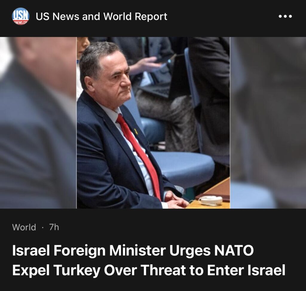 1。据耶路撒冷路透社报道,以色列外交部长周一敦促北约驱逐土耳其。此前土耳其总统塔伊普·埃尔多安威胁说,土耳其可能会像过去进入利比亚和纳戈尔诺-卡拉巴赫那样进入以色列。