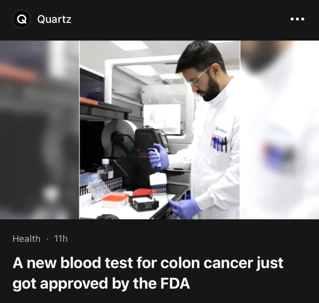 3。据Quartz 报道,一项针对结肠癌的新血液检测刚刚获得 FDA 批准。Guardant Health 的 Shield 测试显示,检测结直肠癌患者的灵敏度为 83%。