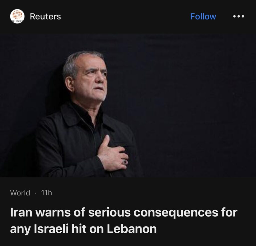 5。据迪拜路透社报道,据伊朗官方媒体周一报道,伊朗总统马苏德·佩泽什基安在与法国总统埃马纽埃尔·马克龙的电话中表示,以色列对黎巴嫩的任何可能的袭击都将给以色列带来严重后果。