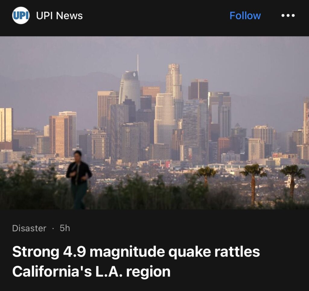 2。7月29日据UPI报道,美国地质调查局称,当地时间周一下午,南加州发生4.9级地震。