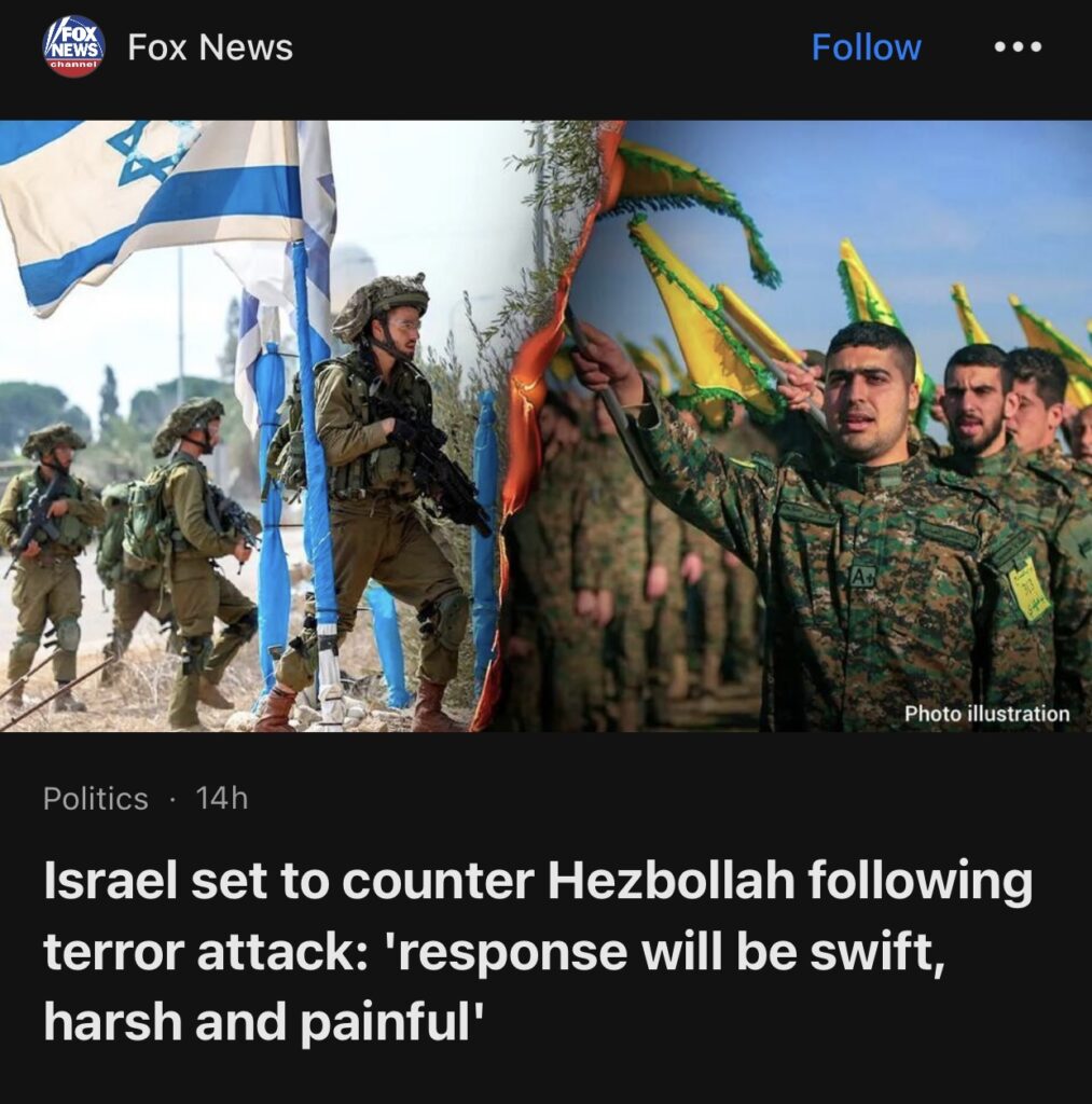 10。据Fox News报道,以色列将在恐怖袭击后反击真主党称,”反应将是迅速、严厉和痛苦的”。
