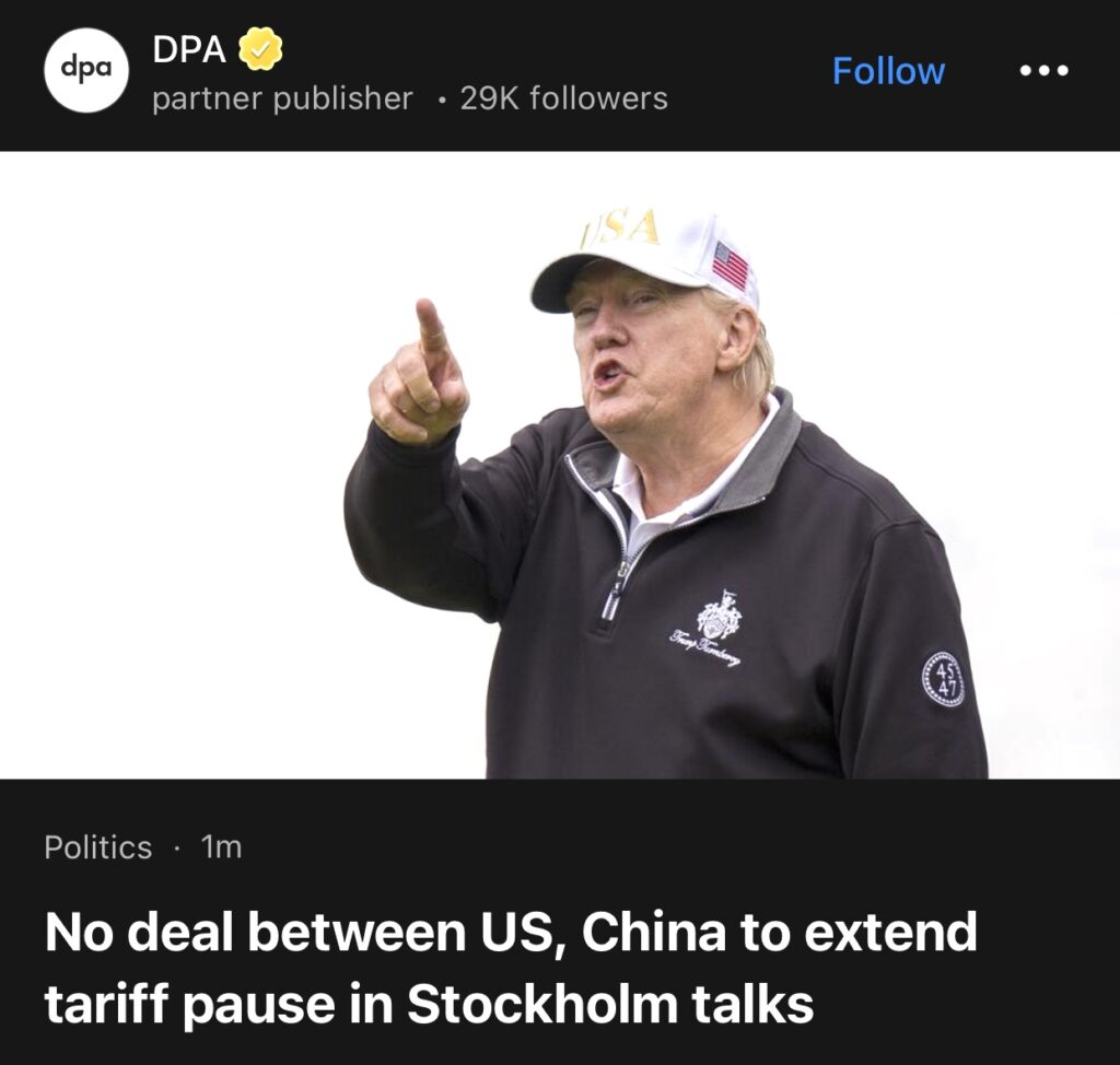 6。据DPA报道,中美未在斯德哥尔摩谈判中达成延长关税暂停期限的协议。