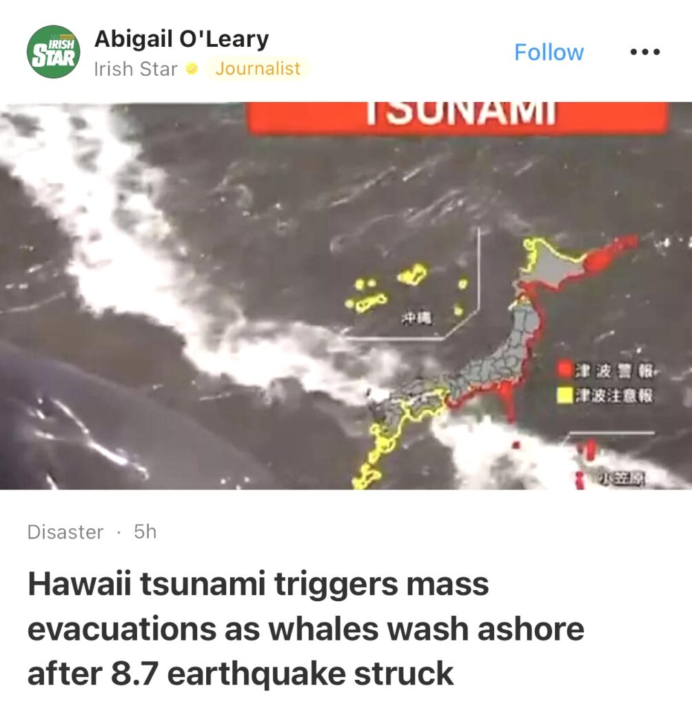 12。据Irish Star报道,俄罗斯地震后,夏威夷发生海啸,鲸鱼被冲上岸,人员大规模疏散。