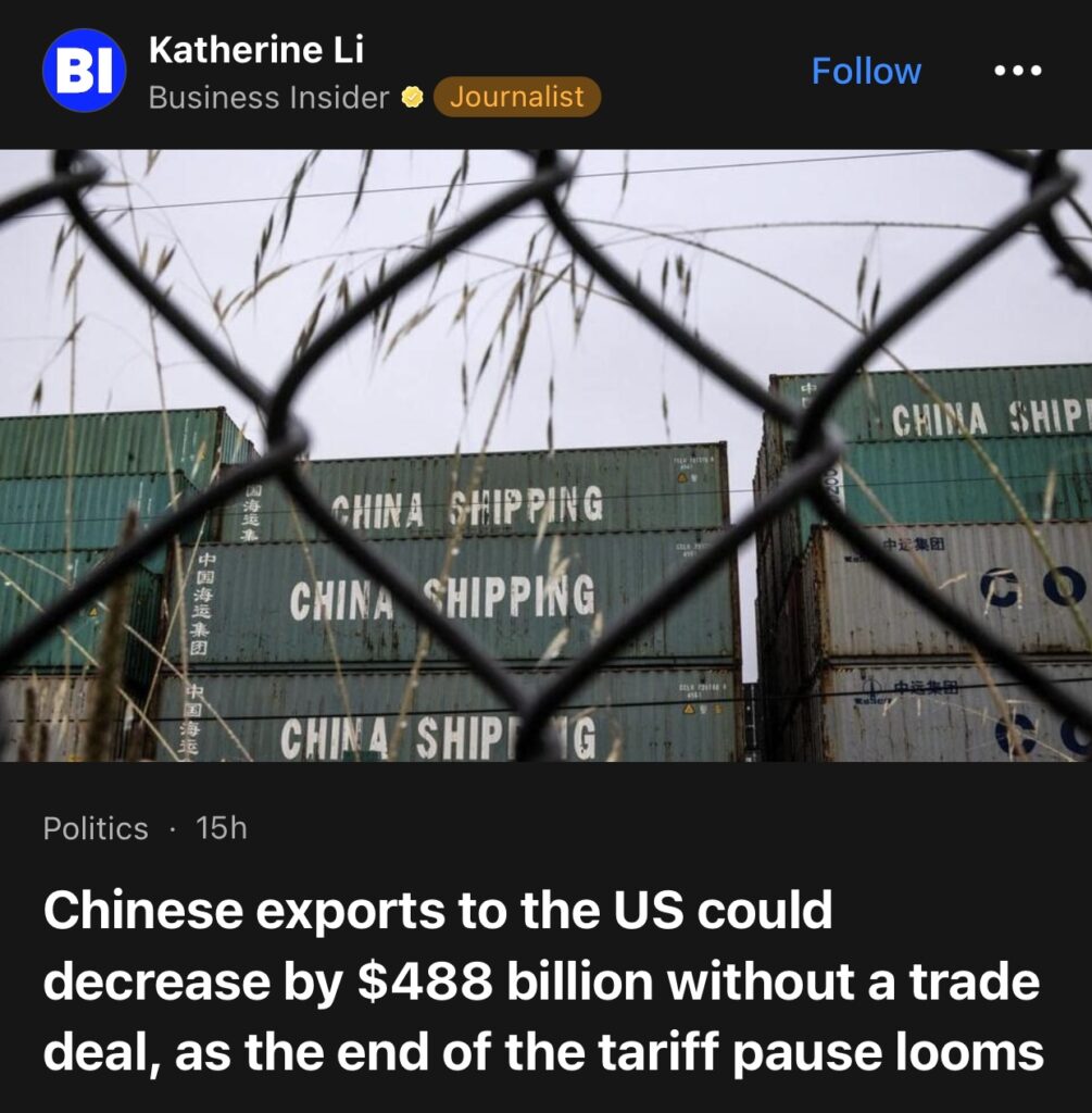 5。据Business Insider报道,如果没有达成贸易协议,中国对美国的出口可能会减少 4880 亿美元,因为关税暂停即将结束。