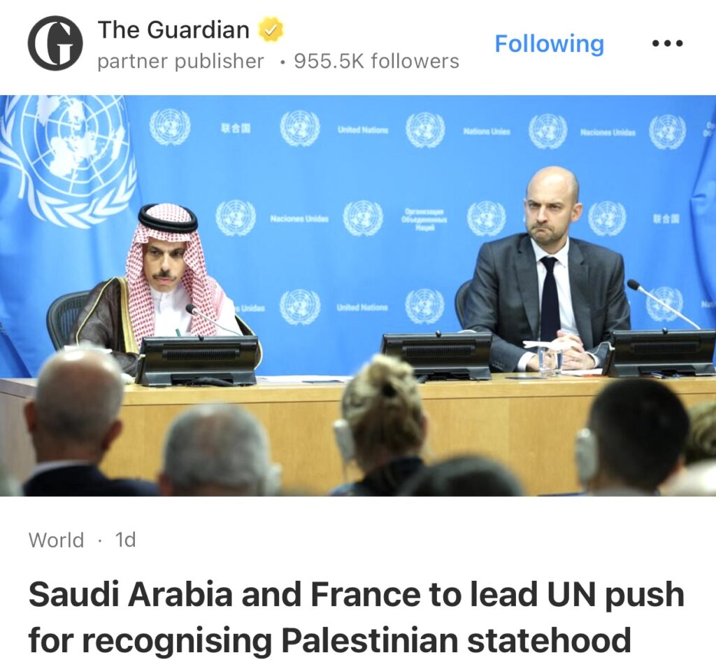9。据The Guardian报道,沙特阿拉伯和法国将领导联合国推动承认巴勒斯坦建国。