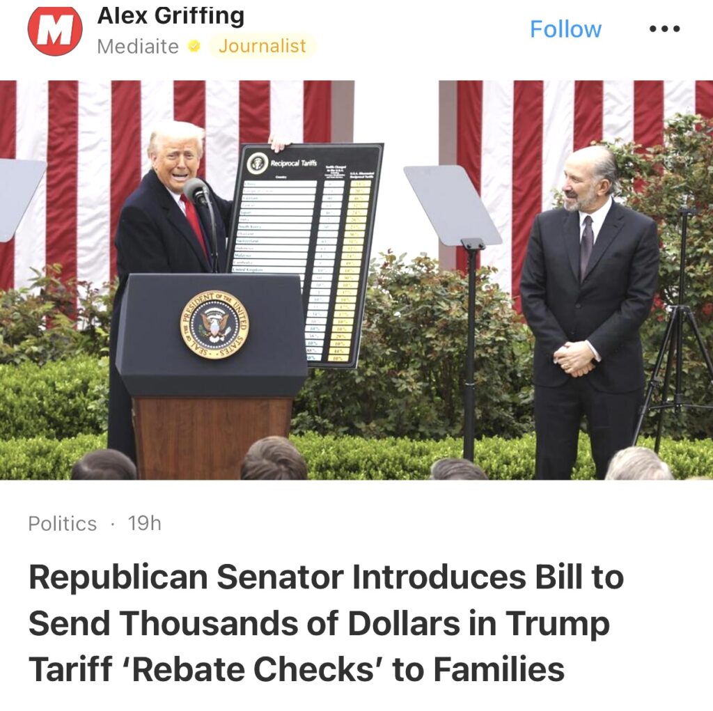 11。据Mediaite 报道,美国共和党参议员提出法案,向美国家庭发放数千美元的特朗普关税“退税支票”。