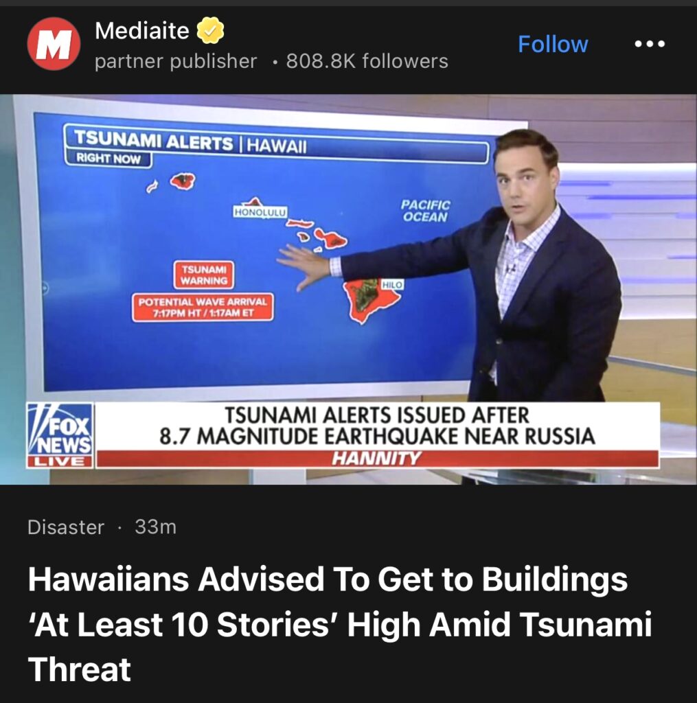 4。据Mediaite报道,夏威夷建议民众前往“至少 10 层”高的建筑物,以防海啸威胁。