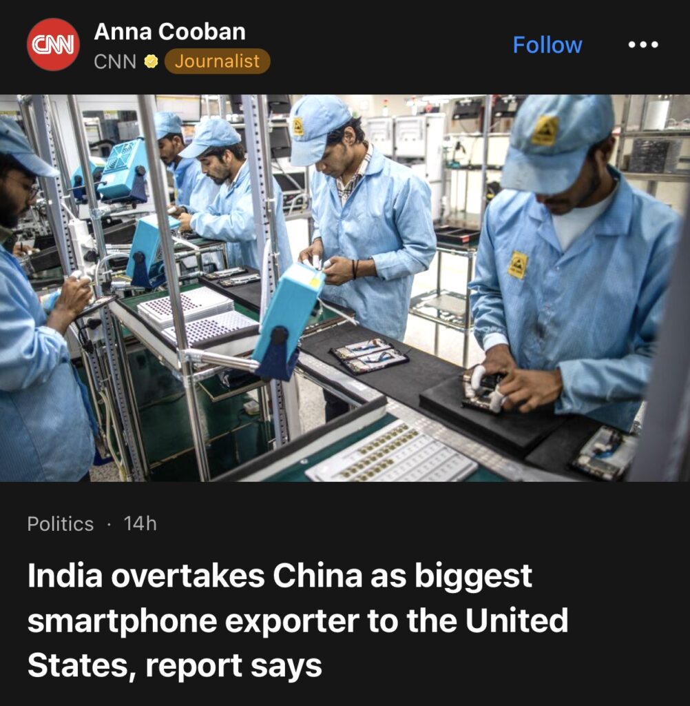3。据CNN 报告称,印度超越中国成为美国最大智能手机出口国。
