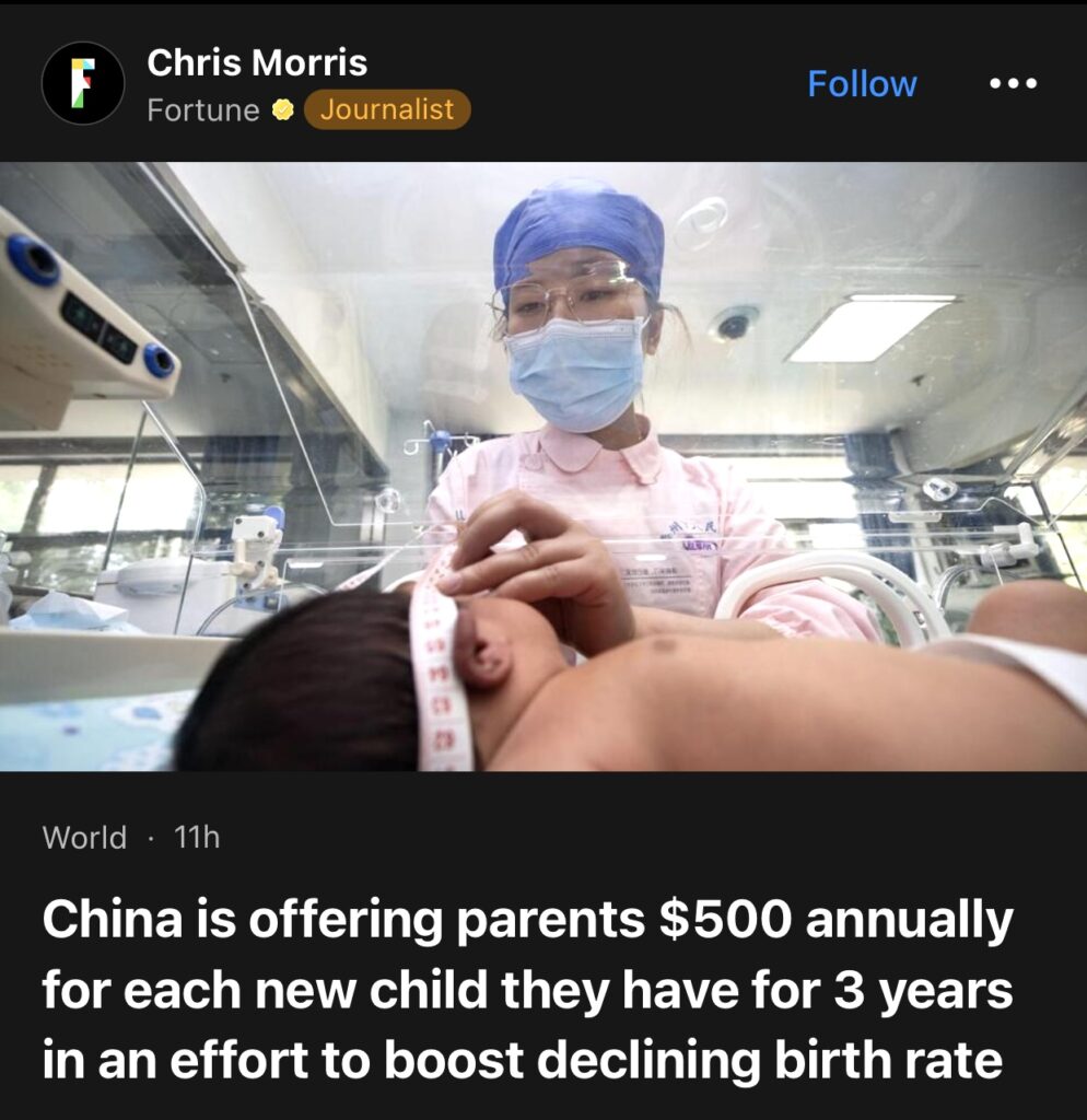 7。据Fortune 报道,中国将为每名新生儿每年提供500 美元的补助,为期三年,以缓解出生率下降的局面。