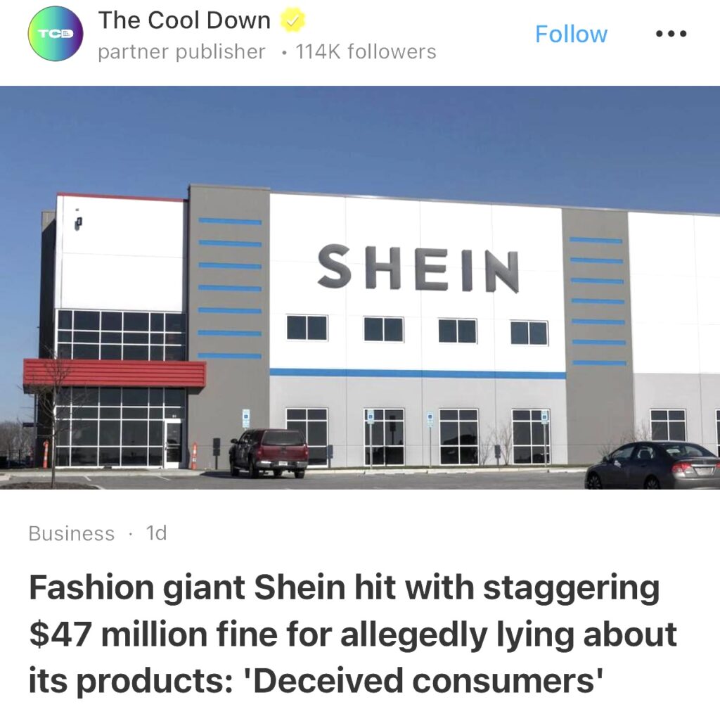 10。据The Cool Down报道,时尚巨头 Shein 因涉嫌对其产品撒谎而被处以 4700 万美元巨额罚款:“欺骗消费者”。