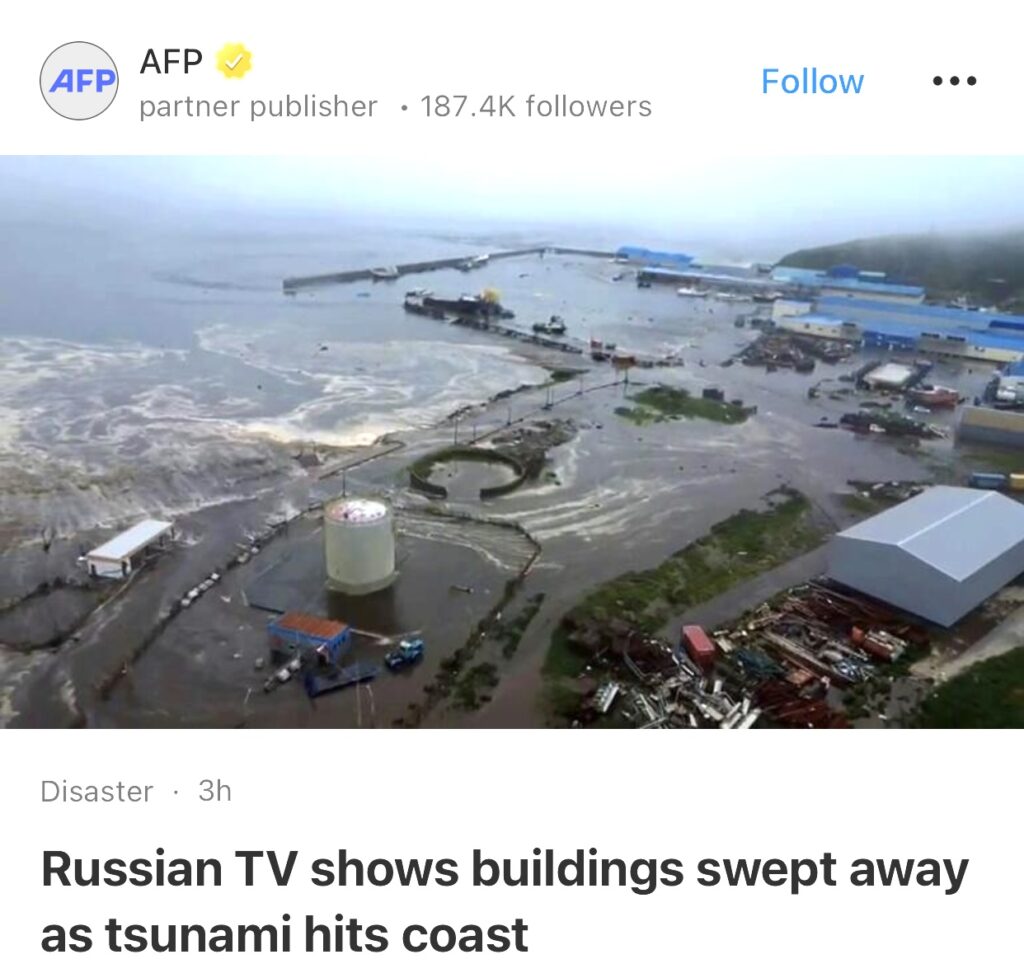 2。据Express U.S.报道,周二,俄罗斯西海岸发生8.7级地震,美国西海岸全境已发布海啸预警。预计破坏性海浪最早将于周三凌晨1:15抵达西海岸。