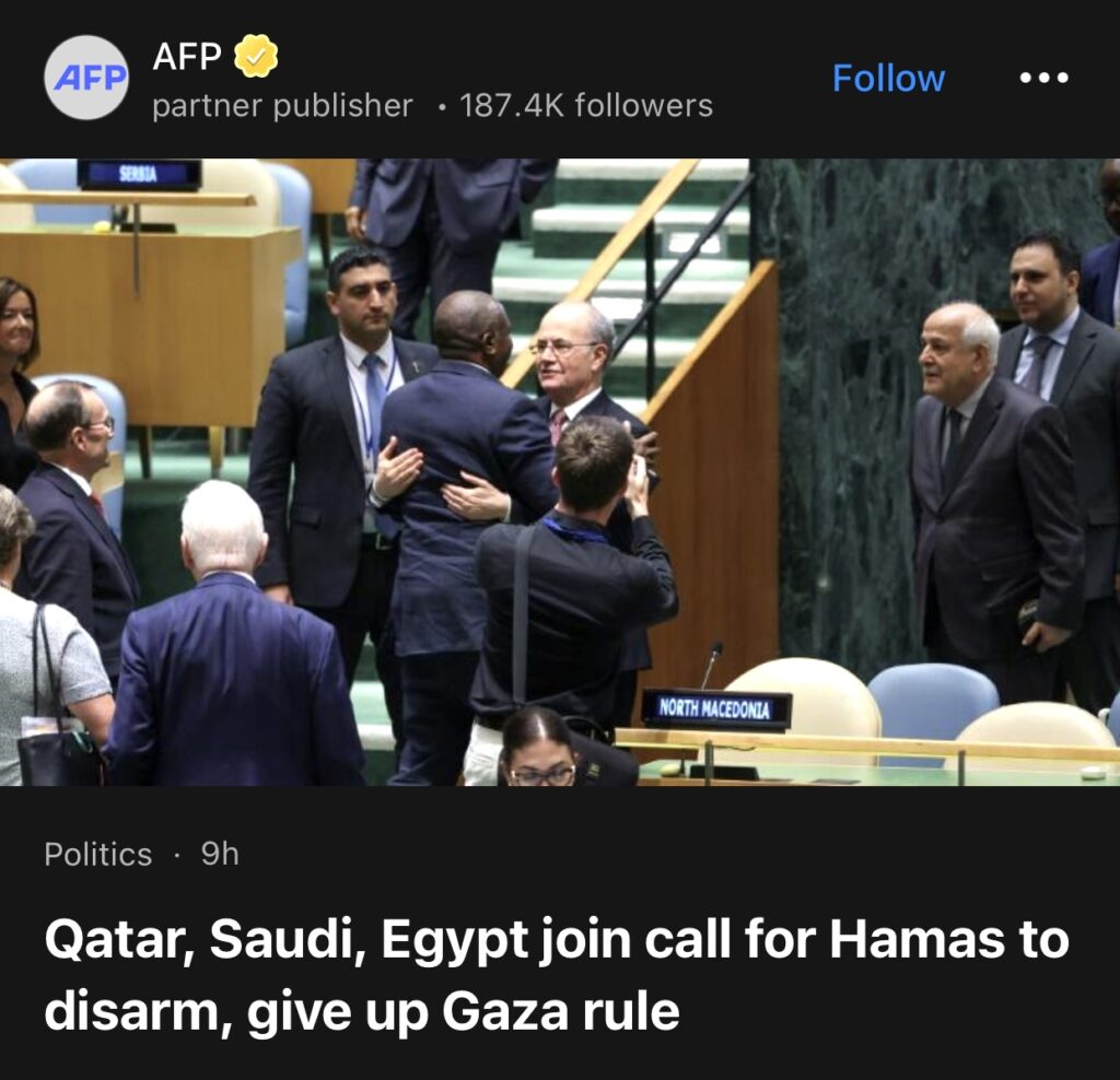 1。据AFP报道,卡塔尔、沙特、埃及共同呼吁哈马斯解除武装并放弃对加沙的统治。