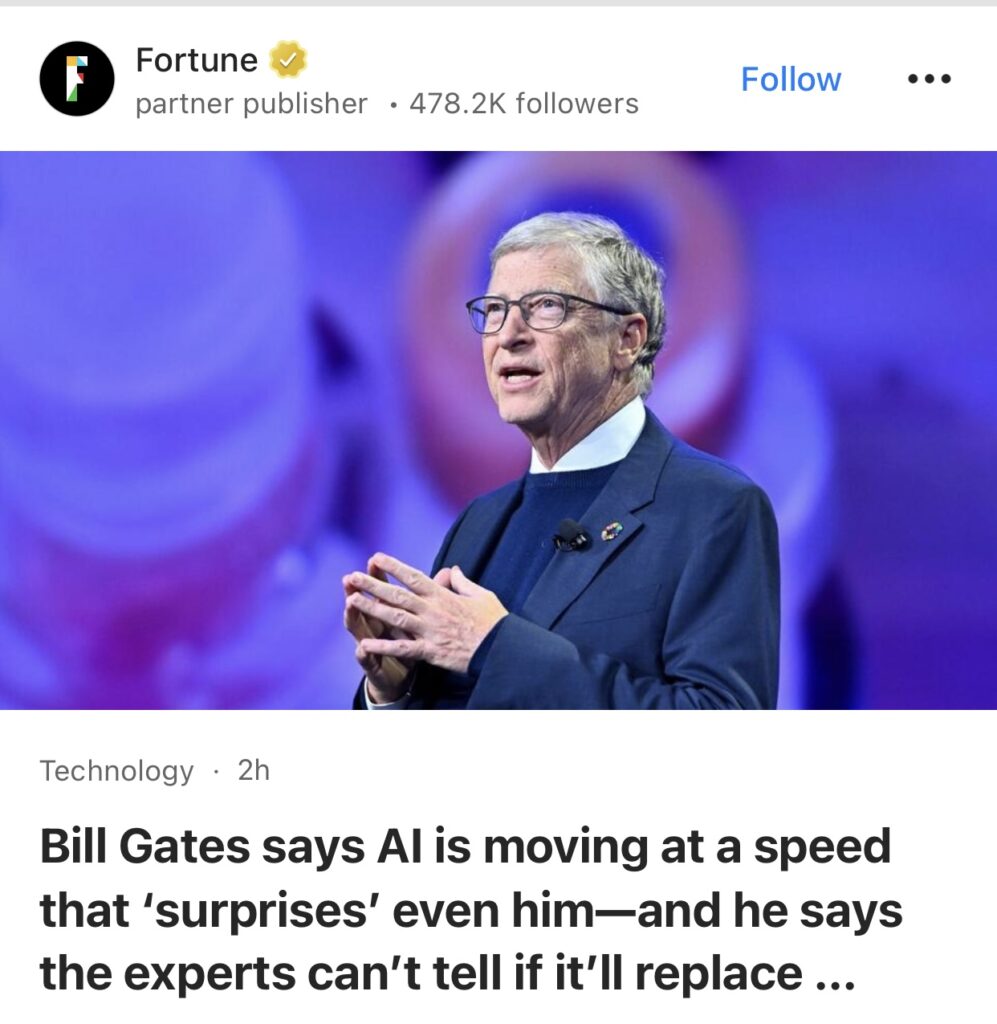13。据Fortune报道,比尔·盖茨表示,人工智能的发展速度甚至令他“惊讶”,专家们无法预测它是否会在一年或十年内取代人类。