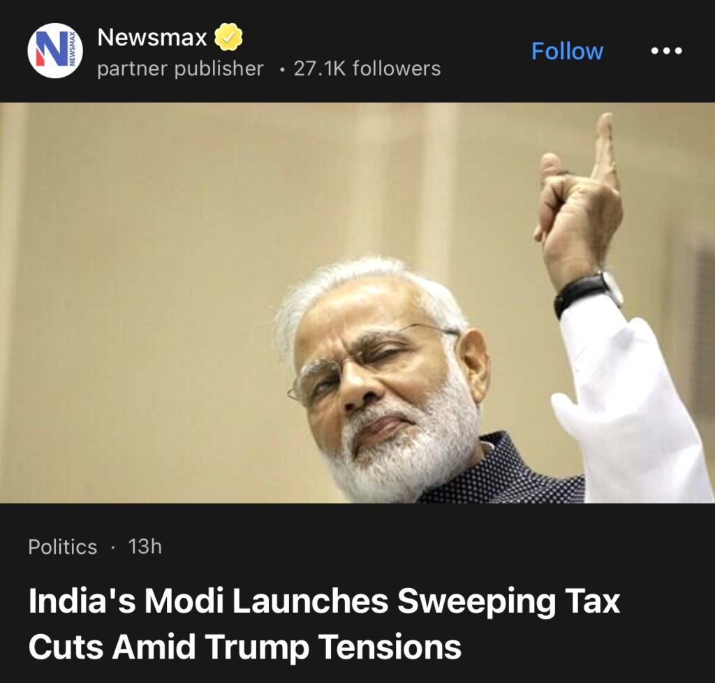 5。据Newsmax报道,印度总理纳伦德拉·莫迪实施八年来最大幅度的减税政策,这将给政府收入带来压力,但却赢得了商界和政治评论家的赞扬,他们表示,此举将在与华盛顿的持续贸易战中提升莫迪的形象。