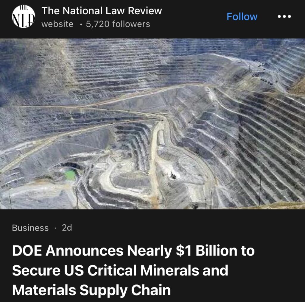 6。据The National Law Review报道,美国能源部宣布拨款近10亿美元保障美国关键矿产和材料供应链。