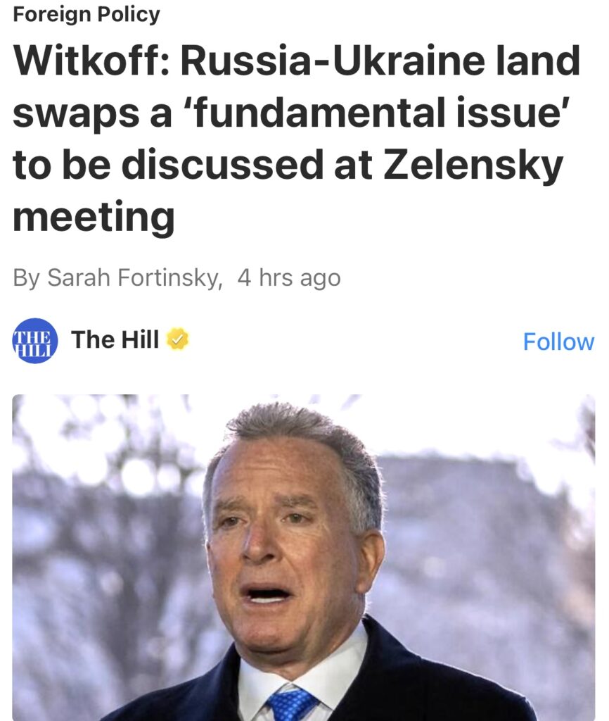 2。据The Hill报道,美国特使史维特科夫称,俄乌土地交换是与泽连斯基会晤将讨论的“根本问题”。