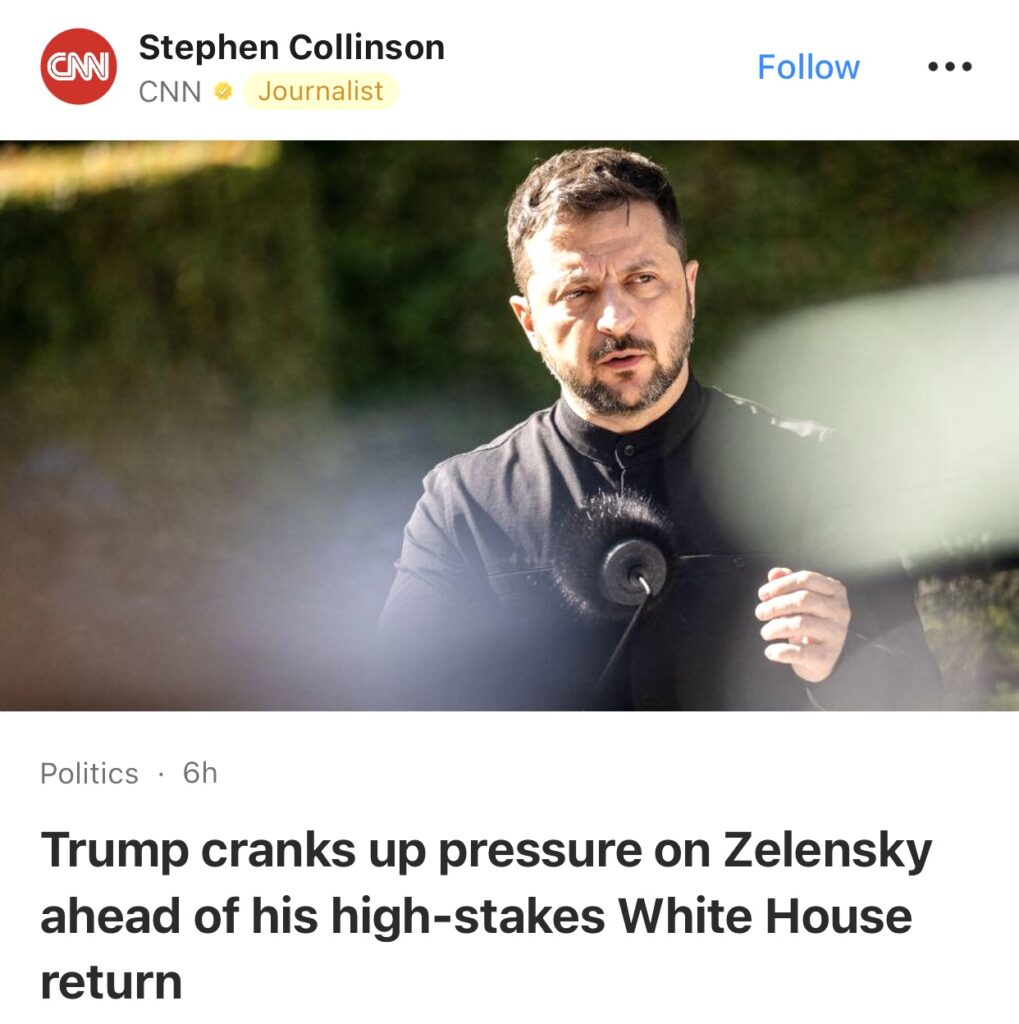 15。据CNN报道,泽连斯基重返白宫前夕,特朗普加大对他的压力。