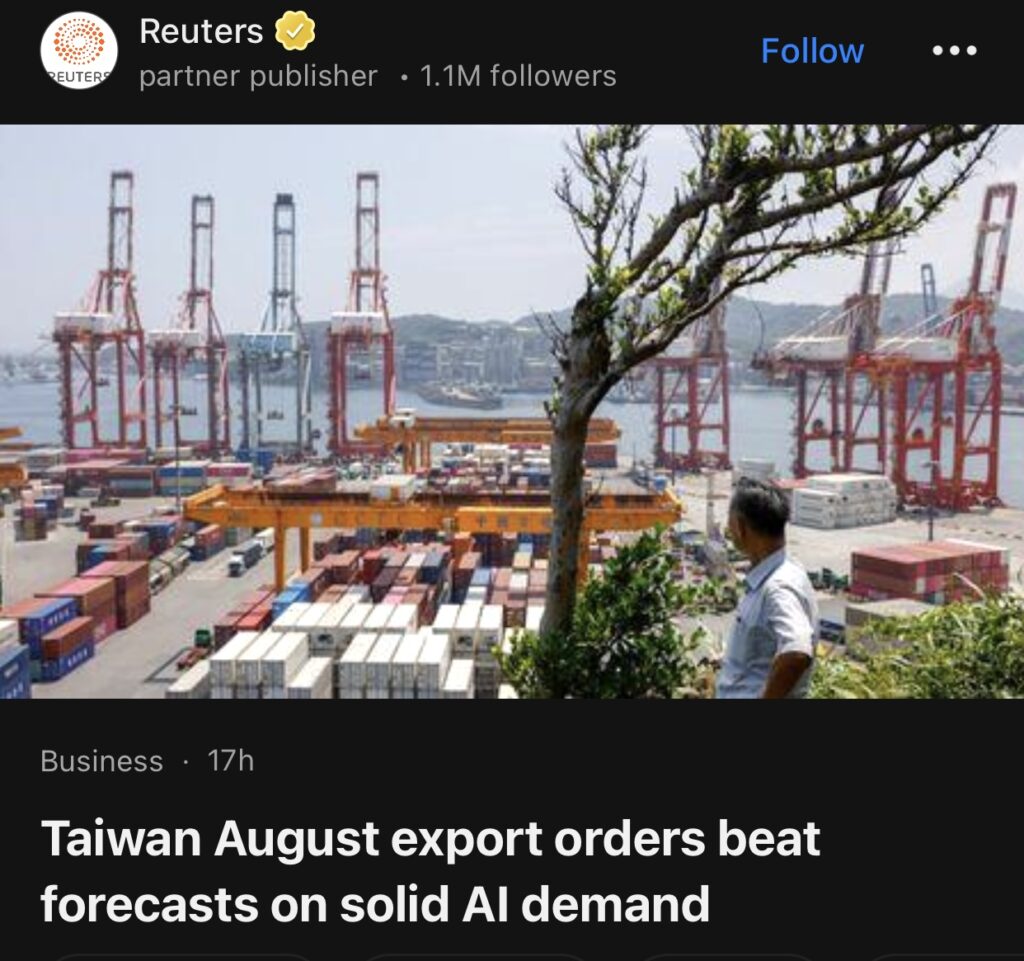 5。台北(路透社)——受人工智能等科技产品需求推动,台湾 8 月份出口订单连续第七个月增长,但全球贸易不确定性继续给前景蒙上阴影。