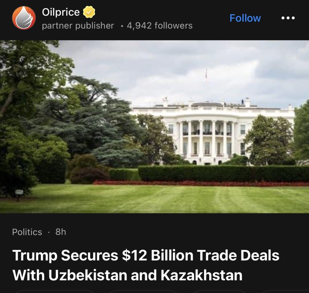 1。据Oilprice报道,美国总统唐纳德·特朗普与乌兹别克斯坦和哈萨克斯坦达成了超过 120 亿美元的贸易协议,白宫正在努力深化与具有战略意义的中亚地区的经济联系。