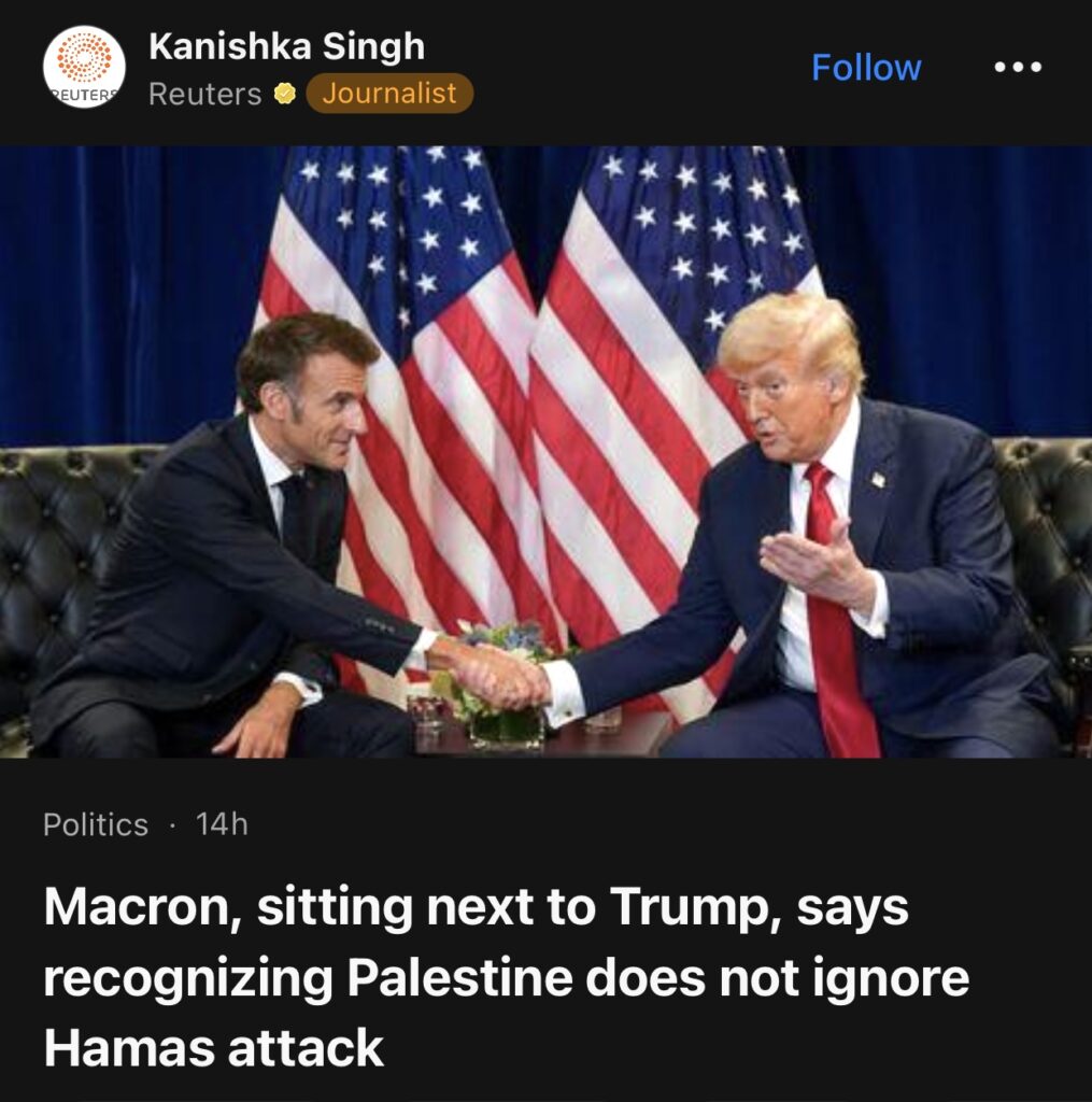 12。据Reuters 报道,马克龙坐在特朗普旁边说,承认巴勒斯坦并不意味着忽视哈马斯的袭击。