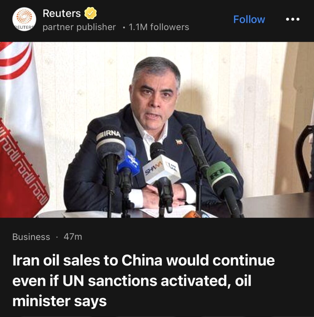 13。迪拜(路透社)——伊朗石油部长穆罕默德·帕克内贾德周三表示,即使联合国根据所谓的“快速恢复”机制重新对伊朗实施制裁,伊朗仍将继续向中国出售石油,因为伊朗和欧洲大国正在努力达成协议以避免制裁。