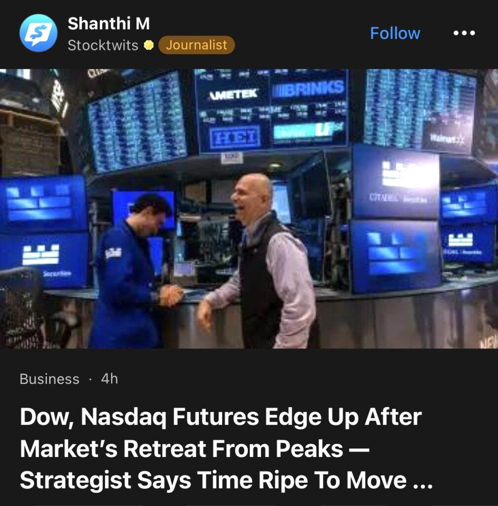 14。据Stocktwits报道,道琼斯指数和纳斯达克指数期货在市场从高点回落后小幅上涨——策略师称现在是将资金转入“中小盘”股票的时机。