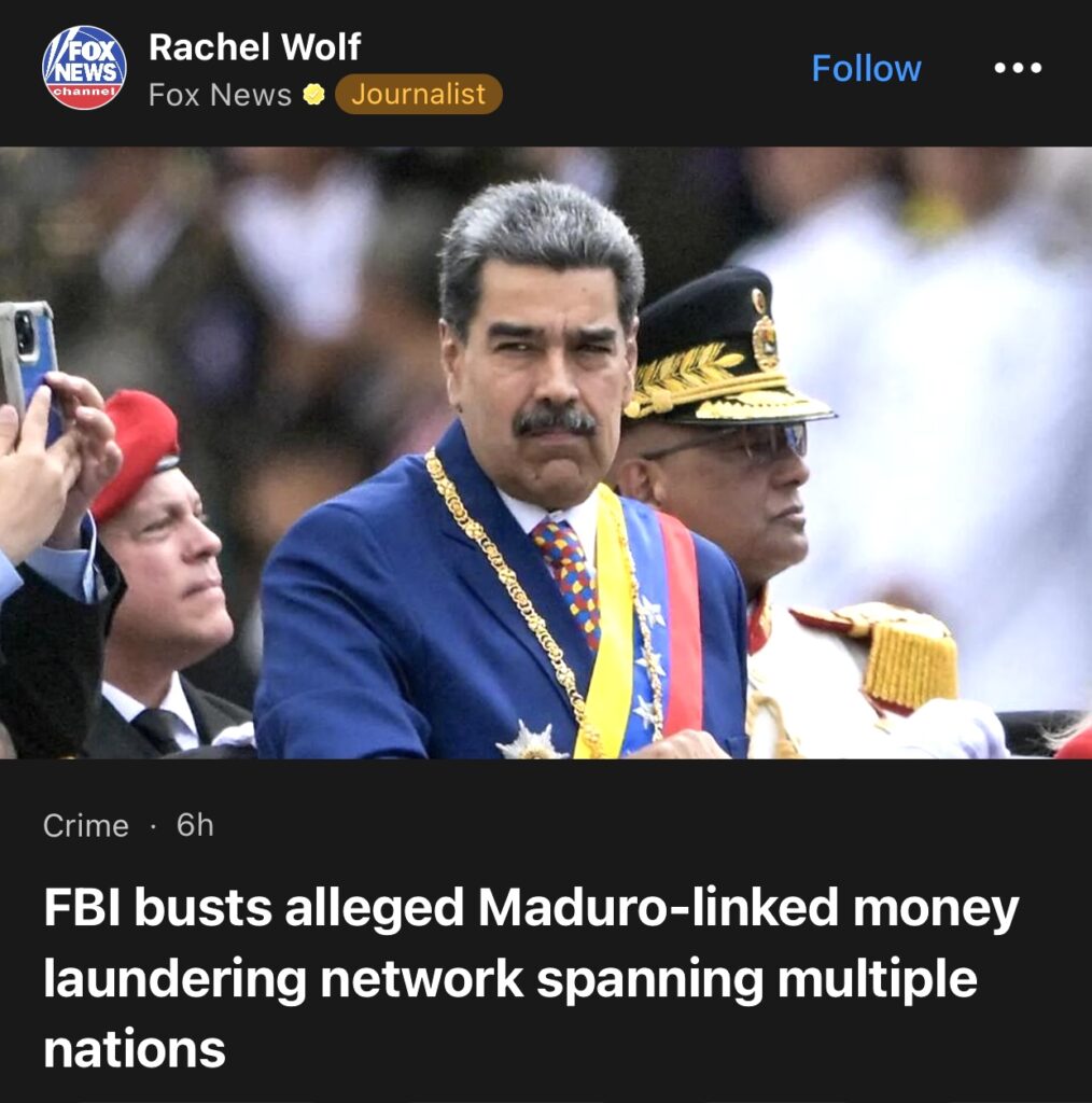 13。据Fox News 独家报道,美国联邦调查局称,两名男子因涉嫌与委内瑞拉独裁者尼古拉斯·马杜罗子女有关的洗钱计划而被起诉。