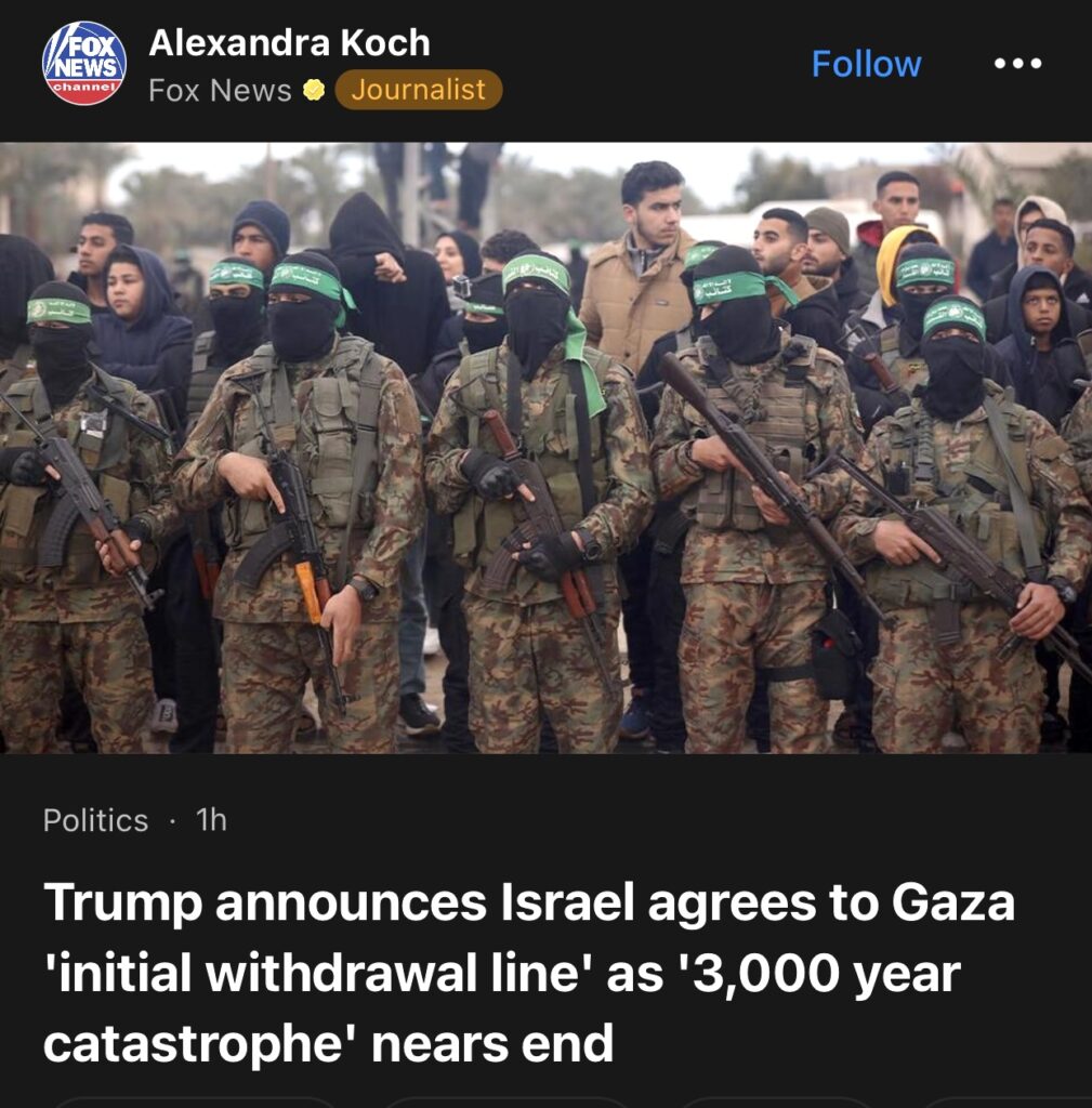 12。据Fox News报道,特朗普宣布以色列同意加沙“初始撤军线”,“3000年灾难”即将结束。
