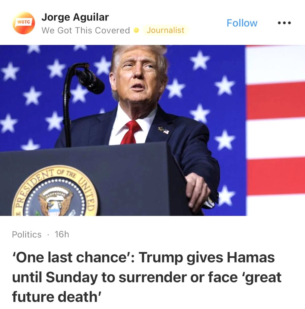 8。据We Got This Covered报道,最后一次机会:特朗普要求哈马斯在周日之前投降,否则将面临“巨大的未来死亡”。