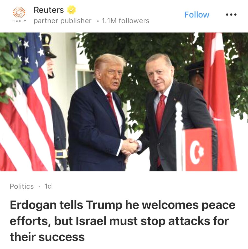2。安卡拉(路透社)——土耳其总统府表示,总统塔伊普·埃尔多安周五在与美国总统唐纳德·特朗普的电话中表示,土耳其欢迎为实现该地区和平所做的努力,但以色列必须停止袭击,才能使努力取得成功。