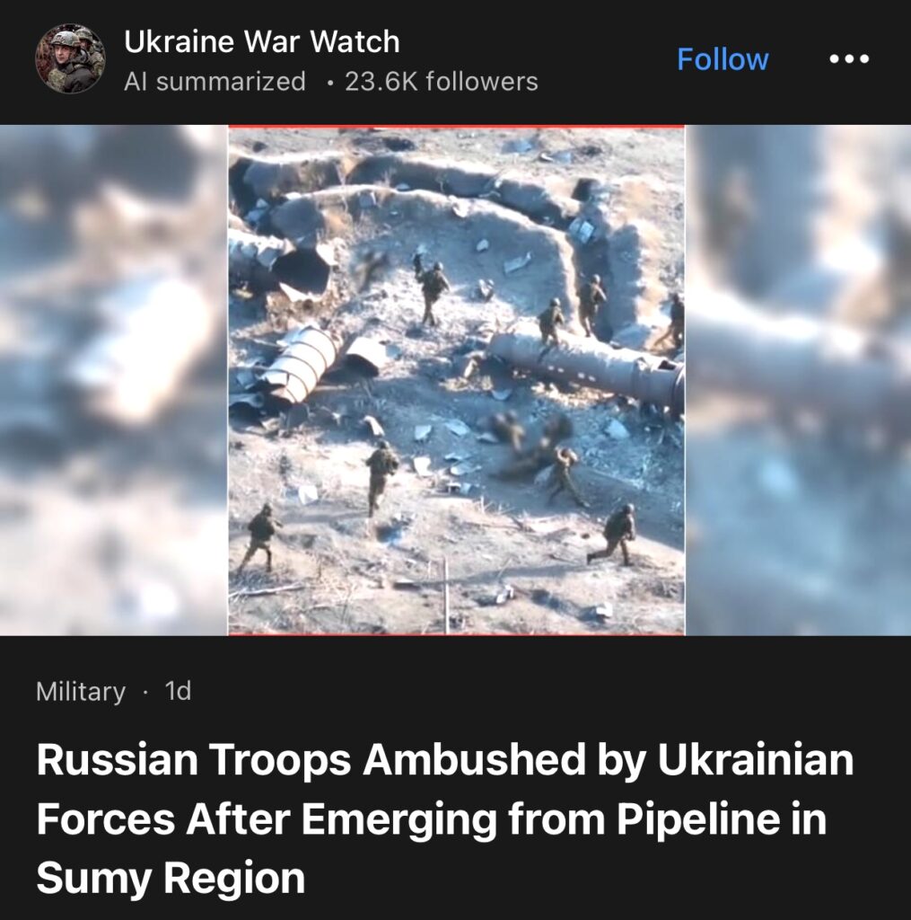 13。据Ukraine War Watch报道,俄罗斯军队在苏梅地区从输油管道出来后,遭到乌克兰军队伏击。