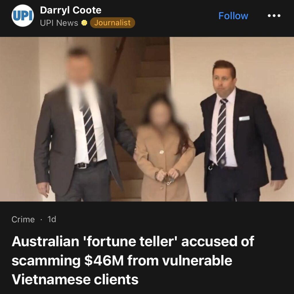 3。11 月 13 日(UPI)——澳大利亚当局逮捕了两名女子,其中一人自称是算命先生,她们被指控从这个大洋洲国家越南裔社区的弱势群体中诈骗超过 4600 万美元。