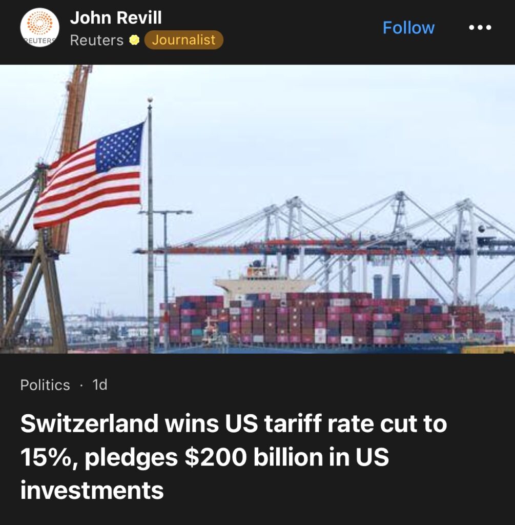 12。据Reuters报道,瑞士赢得美国关税减让至15%,并承诺向美国投资2000亿美元。