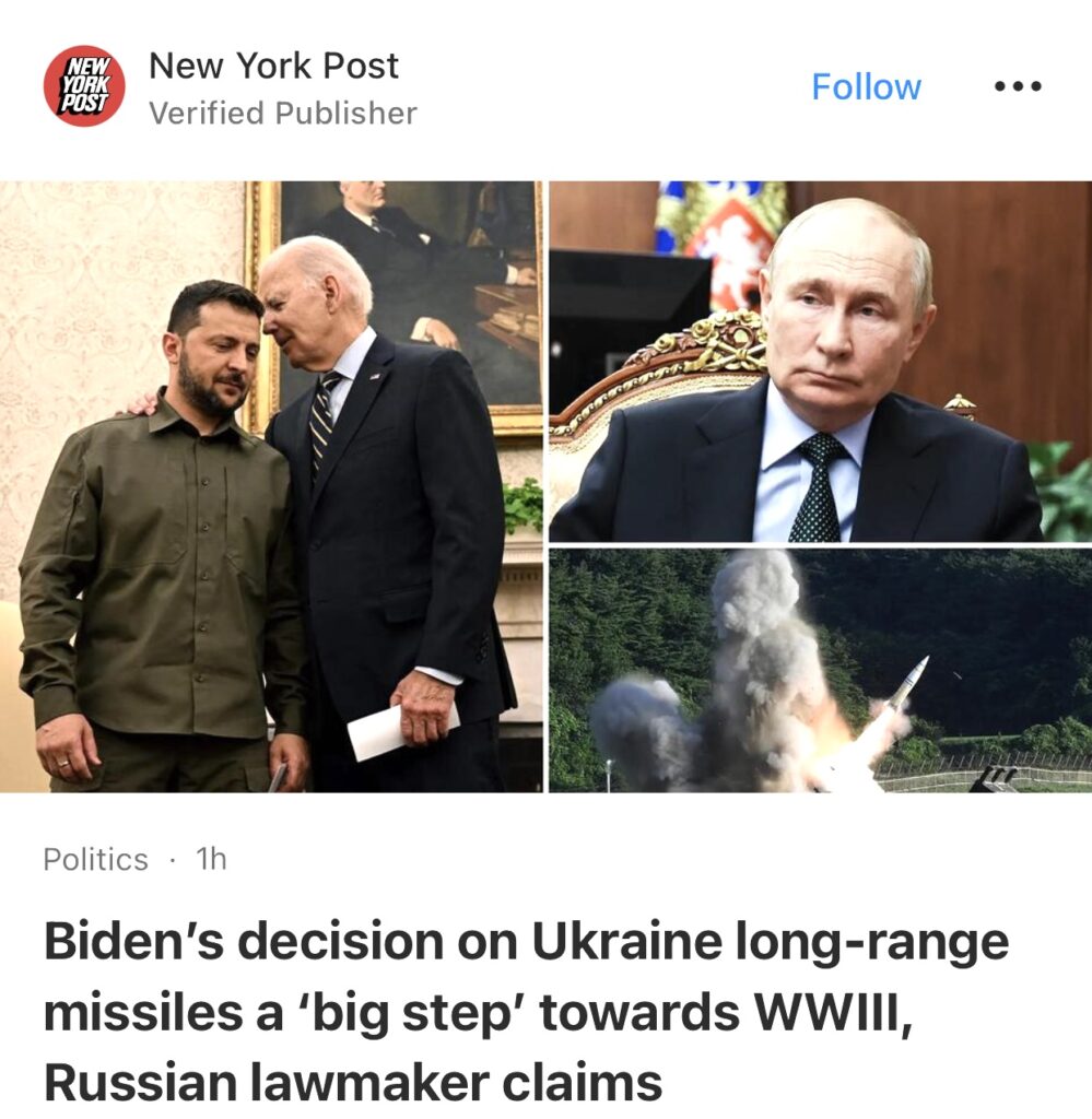 12。据New York Post报道,俄罗斯议员称拜登关于乌克兰远程导弹的决定是迈向第三次世界大战的“一大步”。