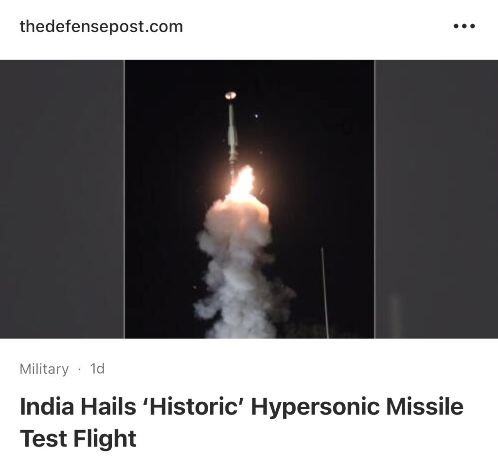 4。据The DefensePost报道印度国防部长周日表示,拥有核武器的印度已经测试了首枚高超音速导弹,在竞争对手中国展示其最新军事航空力量几天后,印度公布了这款超高速高科技武器。