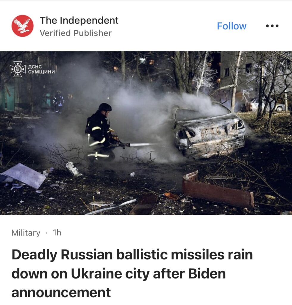 15。据The Independent报道,拜登宣布允许乌克兰使用美国武器袭击俄罗斯内陆后,致命的俄罗斯弹道导弹袭击了乌克兰城市。一枚带有集束弹药的俄罗斯弹道导弹袭击了乌克兰北部城市的一个住宅区,造成包括两名儿童在内的 11 人死亡,另有 84 人受伤。