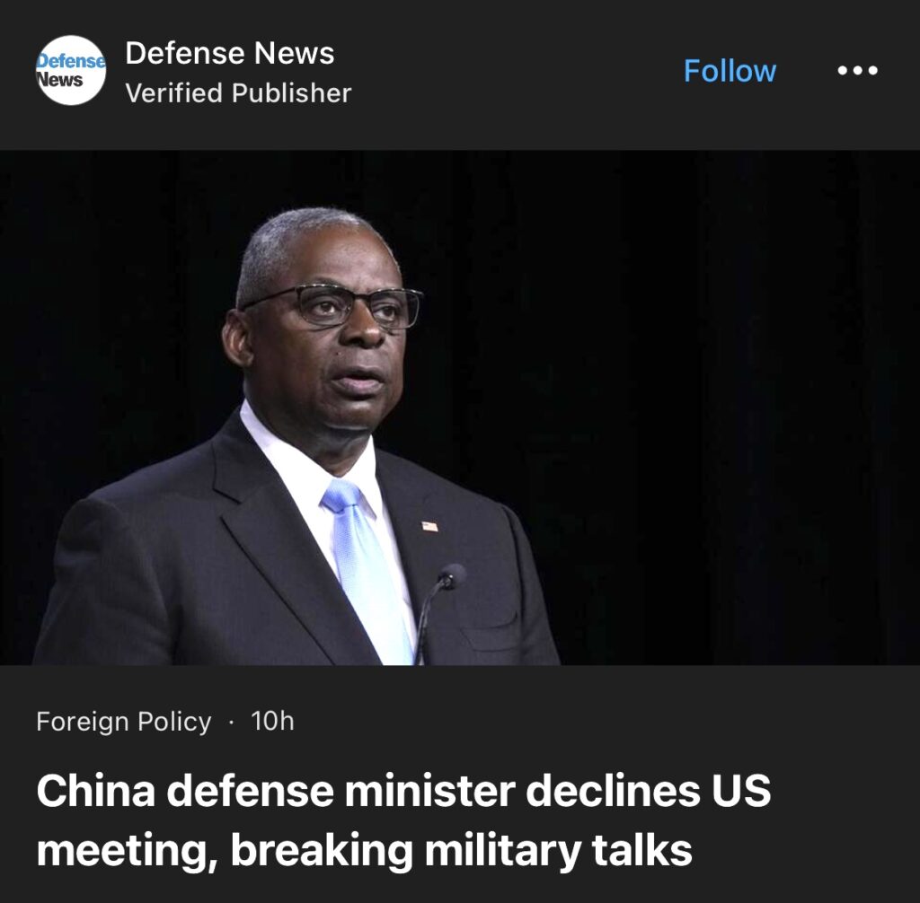 7。据Defense News老挝万象报道,中国国防部长本周不会与美国国防部长会面,这是北京一年来首次暂停高层军事会谈。