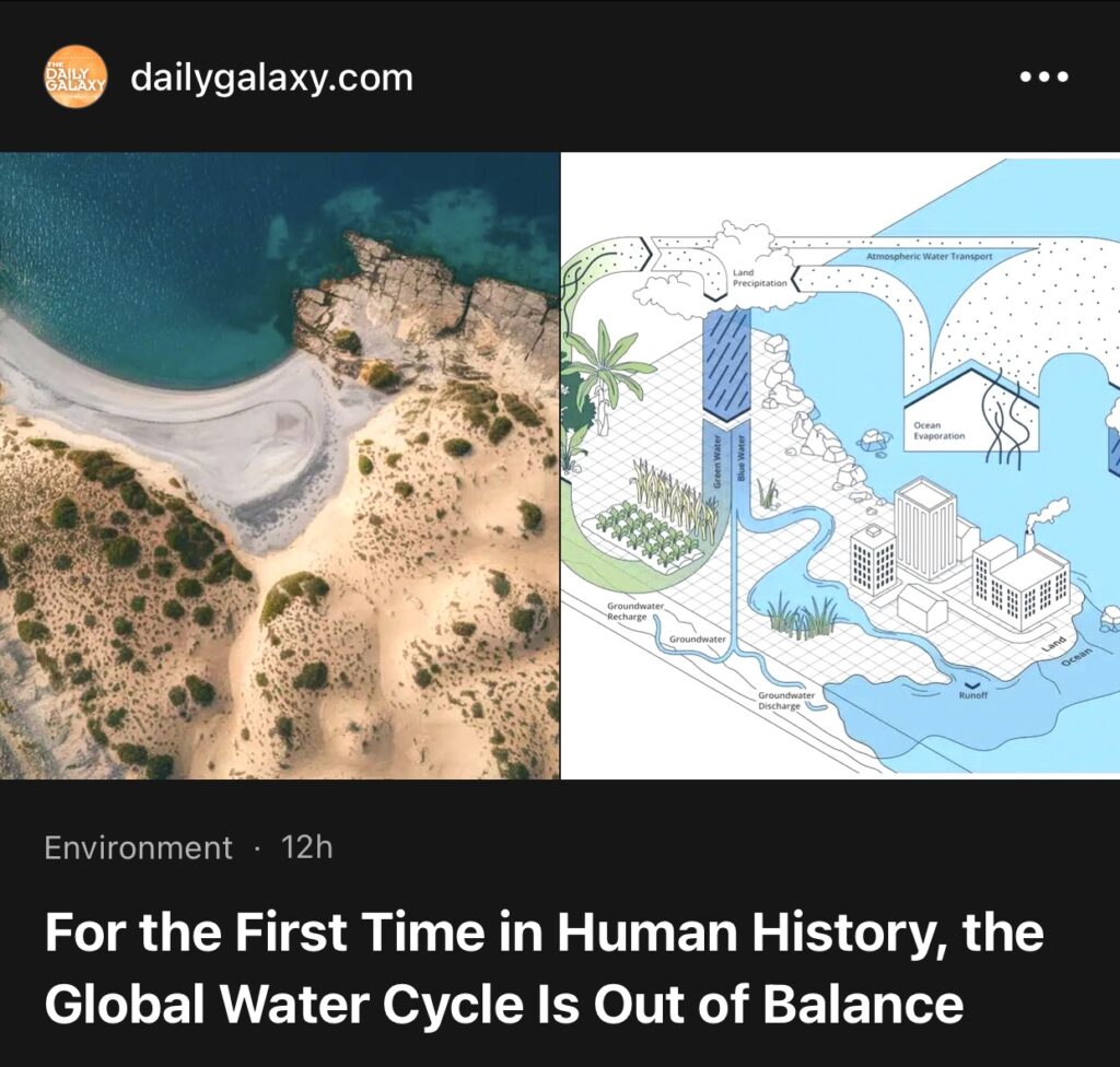 2。据DailyGalaxy报道,人类历史上首次,全球水循环失衡。地球的水循环是一个在地球上分配水的复杂系统,正在经历前所未有的不平衡。这种由人类活动和气候变化造成的破坏,威胁着全球生态系统,并给子孙后代带来了重大挑战。