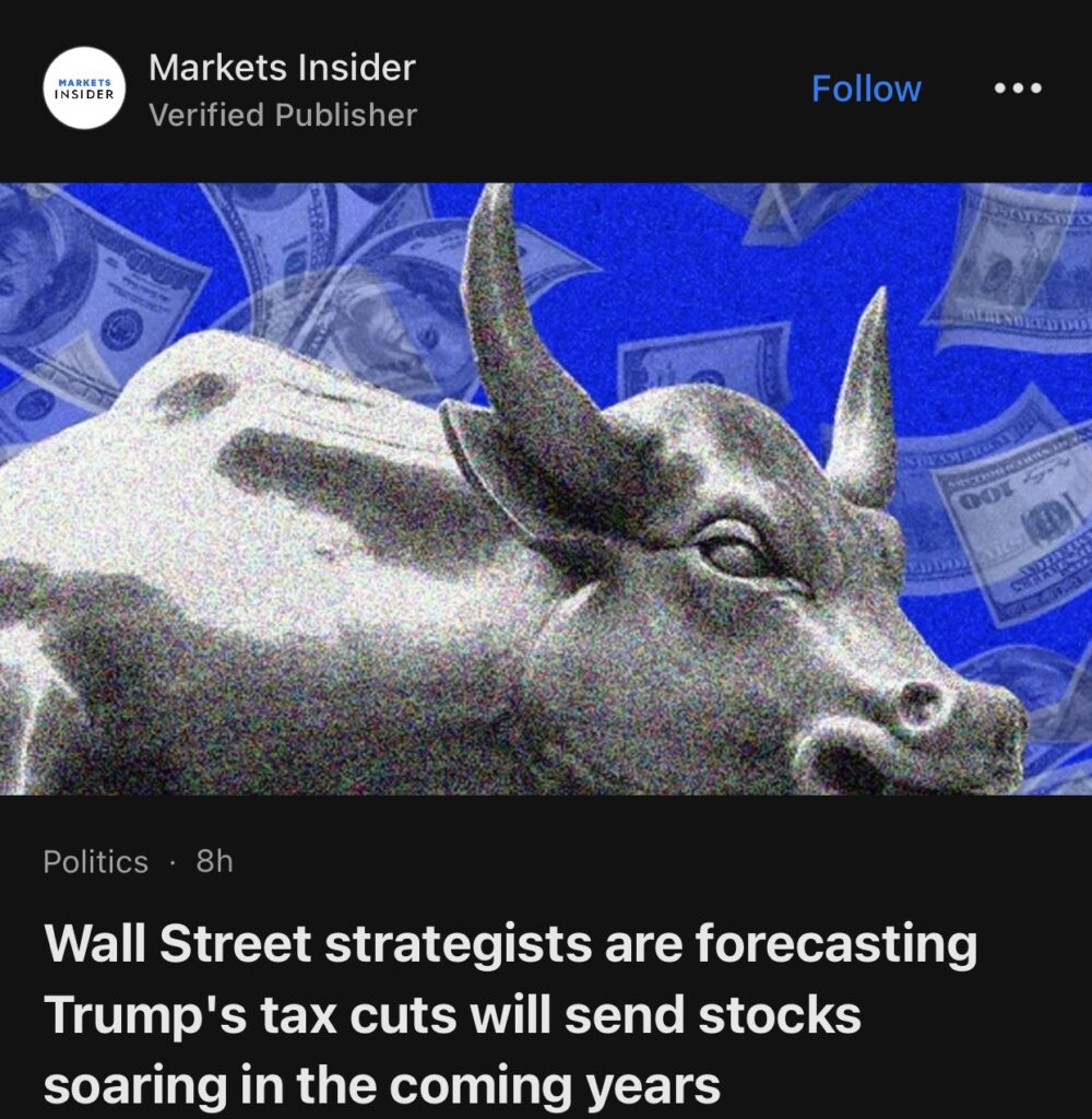 10。据Markets Insider报道,华尔街策略师预测特朗普的减税政策将在未来几年推动股市飙升。