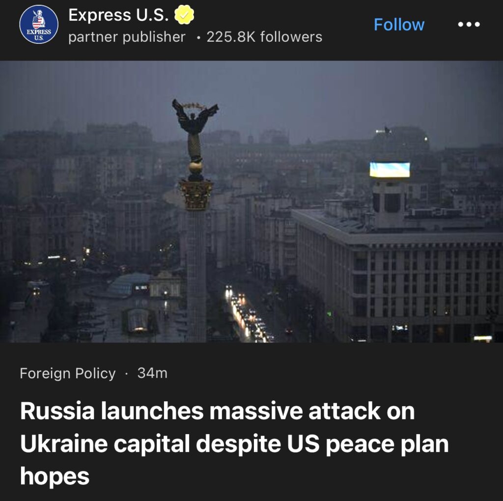 11。据Express U.S.报道,尽管美国对和平寄予厚望,但俄罗斯仍对乌克兰首都发动了大规模袭击。