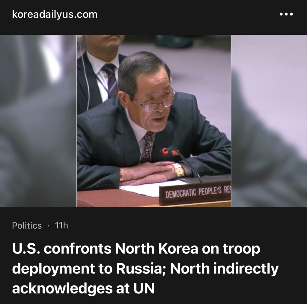 3。据TheKoreaDaily 报道,11月27日,在纽约联合国总部举行的联合国安理会会议上,美国代表直接质问朝鲜代表是否部署军队支持俄罗斯。朝鲜代表回应含糊其辞,表示朝鲜将“继续忠实于朝俄条约的义务”,间接承认了这一部署。