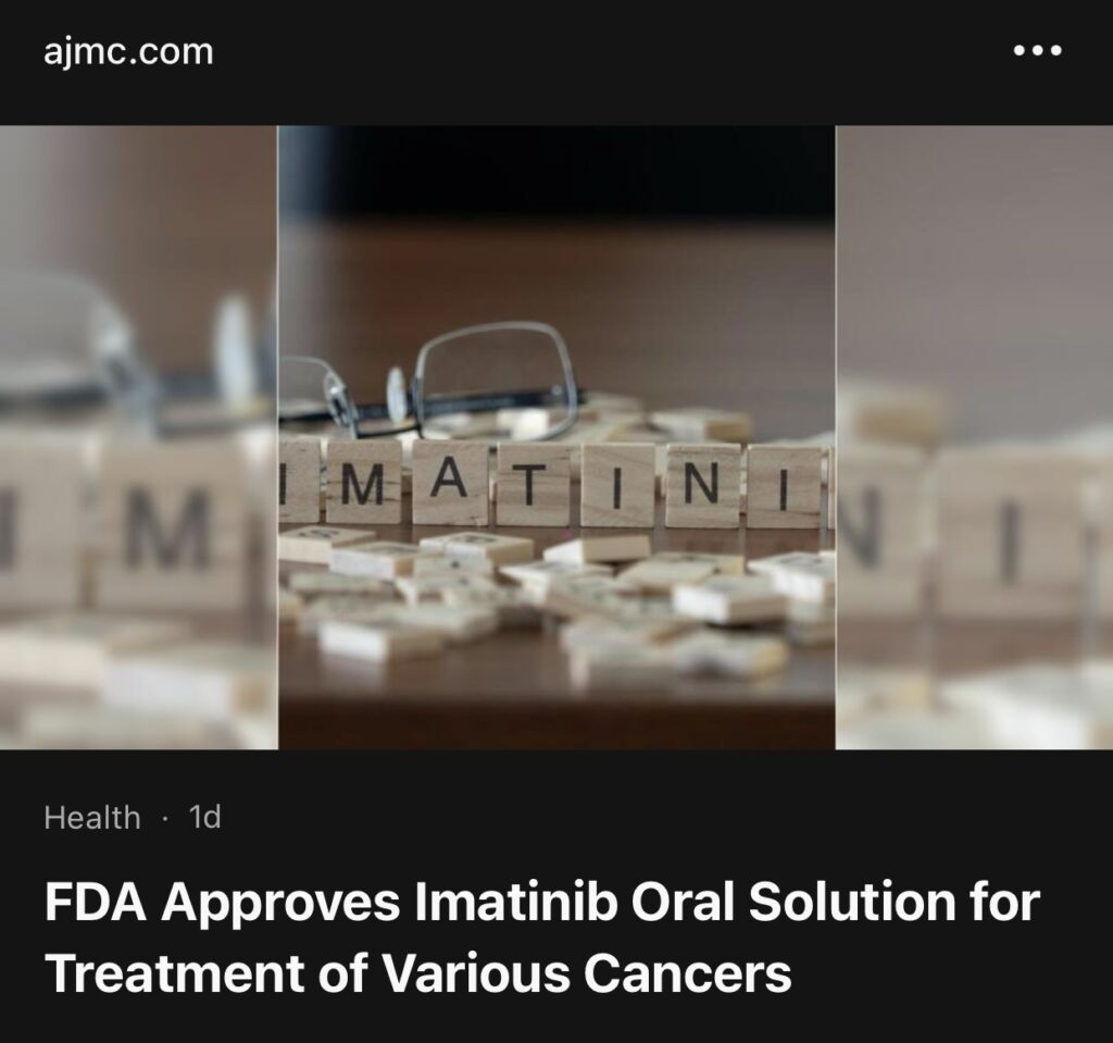 5。据AJMC 报道,FDA 批准伊马替尼口服溶液用于治疗多种癌症。(全文见”世界医学最新简报” worldmednews.com)