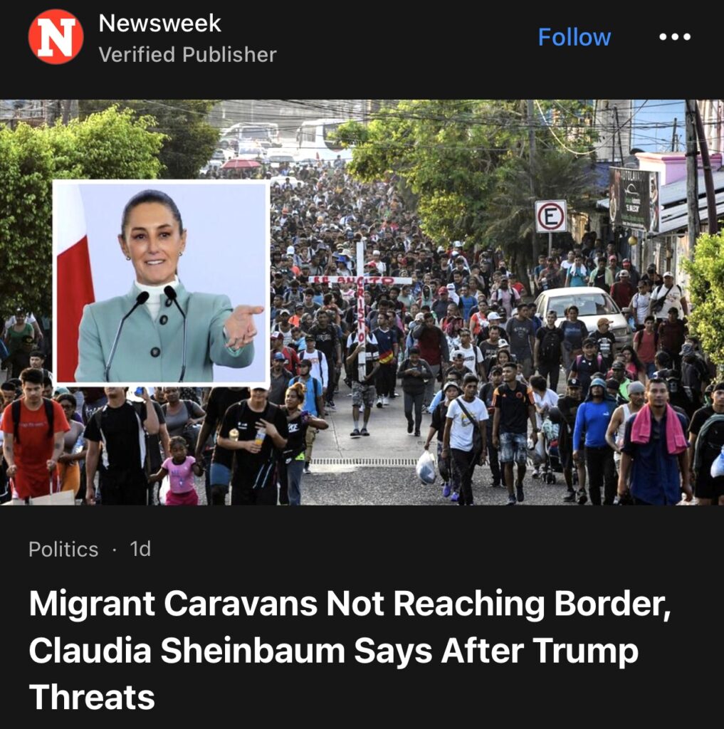 7。据Newsweek 报道,墨西哥总统克劳迪娅·谢因鲍姆在特朗普发出威胁后表示,移民大篷车不会到达边境。