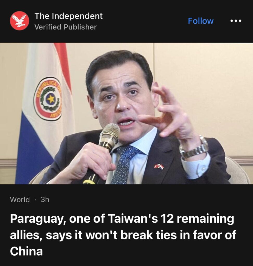 12。据The Independent报道,巴拉圭外长周五表示,巴拉圭致力于发展与台湾的关系,并且没有计划为了支持中国而断绝与台湾的外交关系。