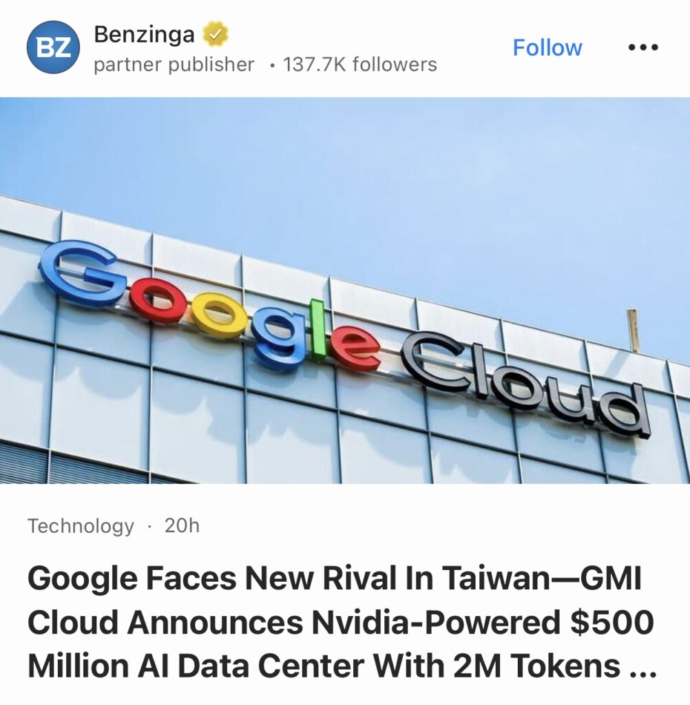 8。据Benzinga报道,谷歌在台湾面临新对手——GMI Cloud宣布斥资5亿美元,采用英伟达技术打造AI数据中心,每秒可处理200万个令牌。