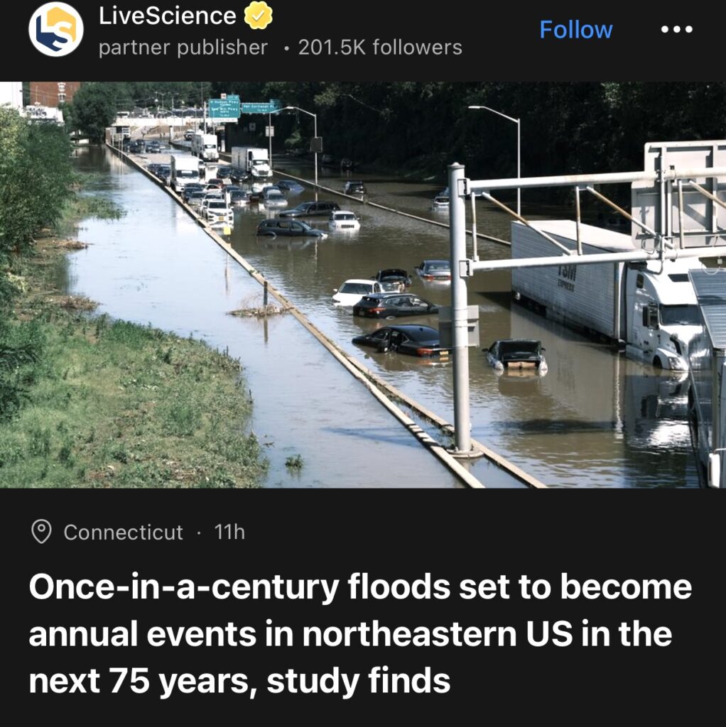 3。据LiveScience报道,研究发现,未来75年内,美国东北部百年一遇的洪水将变成每年都会发生的事件。