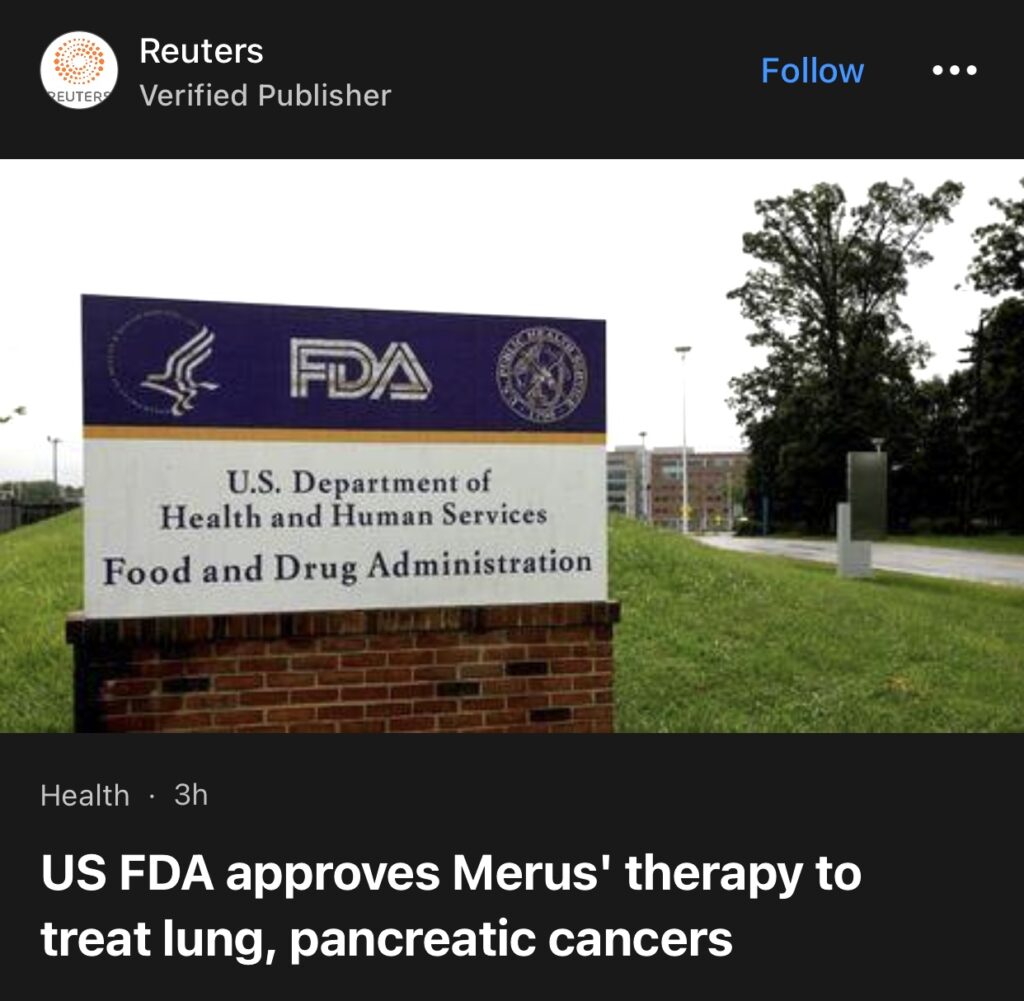 4。据路透社报道,美国卫生监管机构周三表示,美国食品和药物管理局已批准 Merus NV 针对特定基因的疗法,为患有难治性肺癌和胰腺癌的患者提供了一种治疗选择。