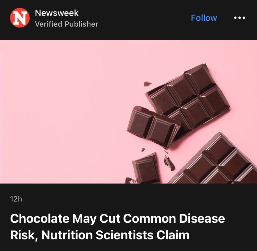 8。据Newsweek 报道,营养科学家声称巧克力可以降低常见疾病的风险。周三发表的一项研究发现,每周吃五份或更多巧克力可将患 2 型糖尿病的风险降低10%。