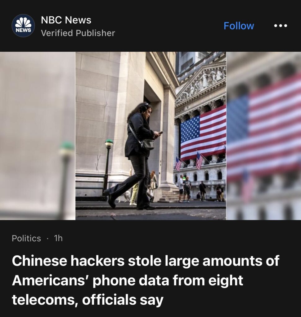 5。据NBCNews 报道,官员称,中国黑客从八家电信公司窃取了大量美国人的电话数据。白宫高级官员周三表示,中国通过黑客攻击电信公司来监视美国公民的短信和电话的黑客活动规模比公众此前所知的要大得多。